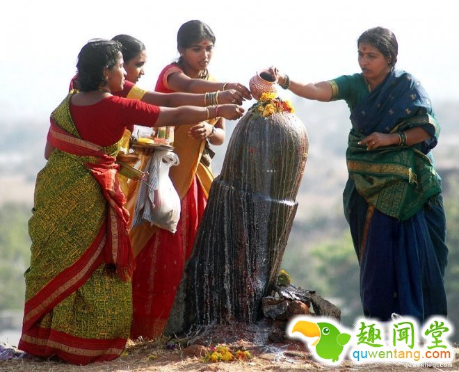 印度湿婆之夜的宗教仪式,妇女们往的印度神石上浇牛奶。