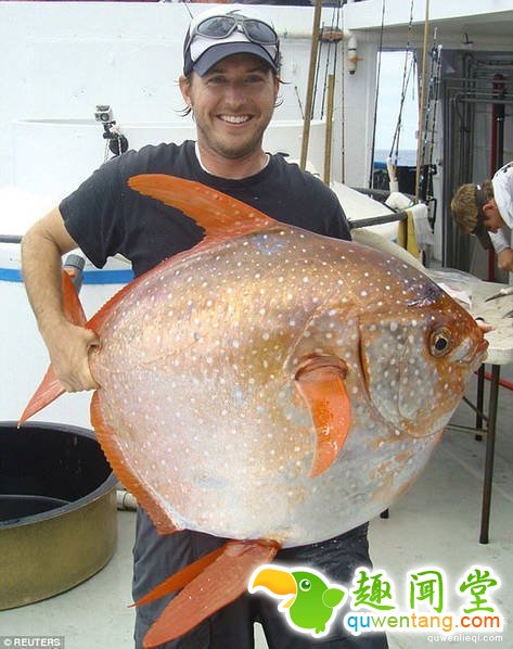 这种鱼被称为月亮鱼。由于它们大多生活在海平面400米以下,靠捕食小鱼和鱿鱼为生因此通常很少被渔民捕获。上周,这只身上带有白色斑点巨型月亮鱼,在美国加利福尼亚奥克斯纳德附近海域被一名叫肖恩的渔夫捕获。