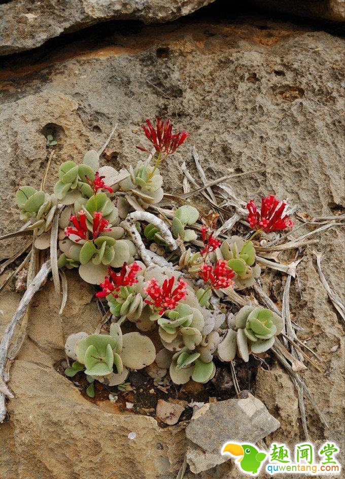 索科特拉岛上90%的爬虫动物和95%的蜗牛品种都是世界其他地方见所未见的。索科特拉群岛上生活着将近200种鸟类,其中埃及秃鹰是最常见的品种,他们憔悴的面容,黄色的脸与索科特拉的奇特风土很相衬。蝙蝠是岛上唯一的原生哺乳动物。图为岛上珍稀植物波斯地毯花。