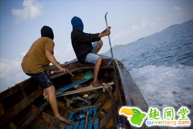现代社会,索马里海盗的猖狂人尽皆知。他们危害着世界上的往来船只,抢夺了大量的血腥财富。但是在印尼的一块地区,却有这样的一群海盗,他们的抢掠工具仅是斧头、柴刀之类的原始工具。他们虽然穷,却在印尼海峡地区无恶不作。图中,海盗们正乘坐着自己的木船。