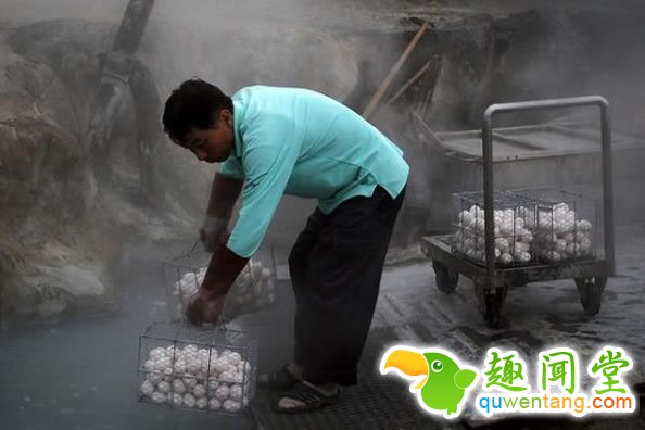 温泉从地下不断涌出,浑浊的水热气腾腾。当地人把鸡蛋装进筐里放到温泉中,过会儿取出时,那些白白的鸡蛋都变成了黑色。这些像生铁球似的鸡蛋却有个好听的名字,叫“黑玉子”。据说,每吃一个“黑玉子”,就能多活7年。
