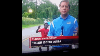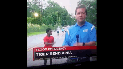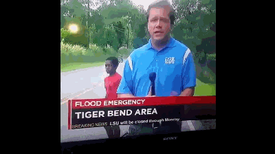 近日,美国WAFB电视台(美国哥伦比亚广播公司CBS附属电视台,驻路易斯安那州首府巴吞鲁日——观察者网注)记者在洪灾现场进行报道时,一个熊孩子躲在记者背后,以一段“精湛”的即兴舞蹈实力抢镜。