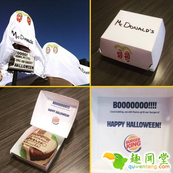位于纽约皇后区的汉堡王,为了万圣节,大玩“反串”,在招牌上盖上大大白布,挖了两个洞,搭配黄色的M字,写上McDonald’s。