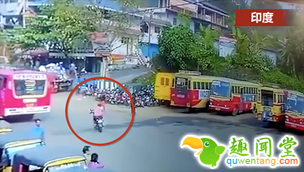 印度一名男子被监控拍到他与死亡擦身的惊险时刻。监控视频中可看到,他与公车擦撞后摔车,整个人不但被卷入车底,还被车轮直接辗过。