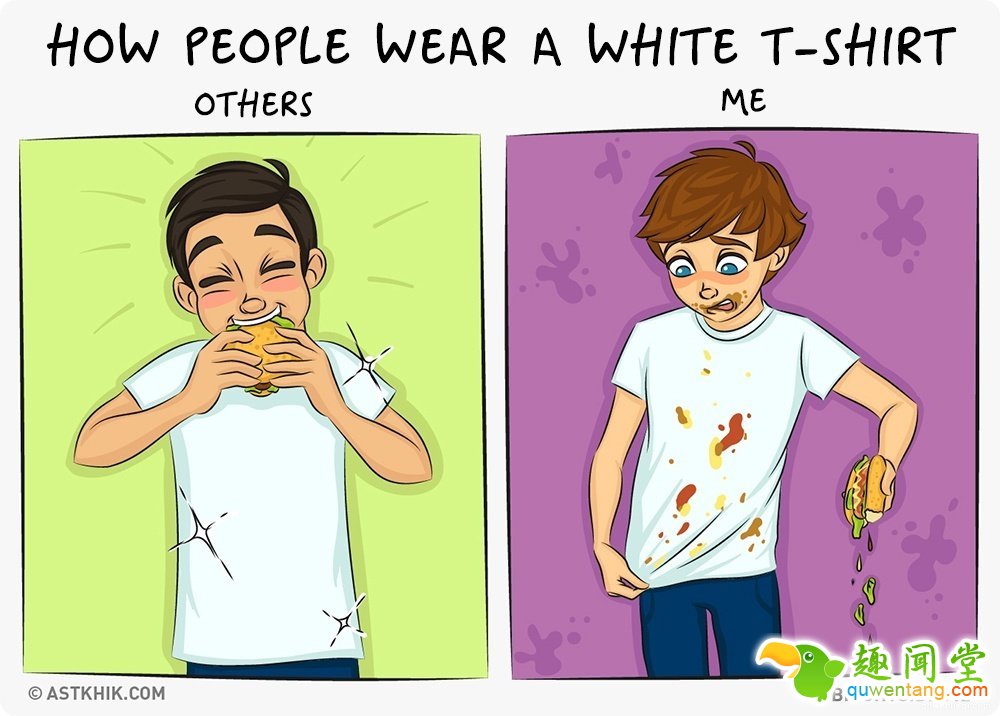 别人穿白T吃东西都没事,我每次都会把白T给毁了。
