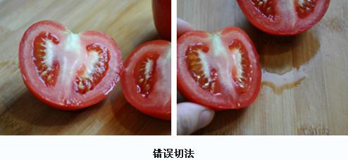 1、错误切法:很多人切西红柿时,都是随意一刀切下去,这样就切破了西红柿水分丰富的瓤囊,汁液自然就流出来了。汁液是西红柿的精华所在,汁液流失就意味着营养成分也随着流失。