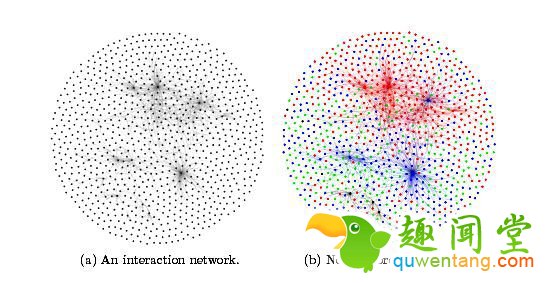 左图:每个黑点代表用户。右图:每个点代表一条微博。红色代表愤怒,绿色代表高兴,蓝色代表忧伤。图片来源。