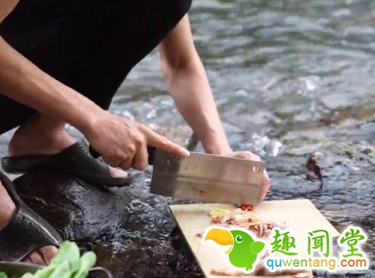 自家做的腊肉在溪水里洗干净干净,然而切成片状。