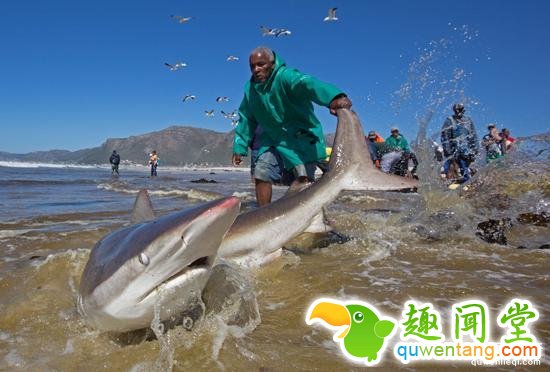 据英国《每日邮报》报道,近日,生活在南非开普敦海岸的一群渔民无意间用网捕到一条巨型鲨鱼,决定合力将它拖回海里放生。在这个过程中,面对巨鲨的血盆大口,这些勇敢而又善良的渔民表现得毫不畏惧,令人十分感动。