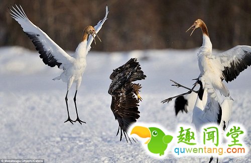 日本41岁的摄影师Ciming Mei 在北海道地区的雪地中拍到了这一精彩场面。当地刚下完雪,地面都被大雪覆盖,丹顶鹤常吃的灌木和鱼都在雪层之下。正当一群丹顶鹤准备进食时,一只老鹰飞了过来,想抢走丹顶鹤的嘴边食物。