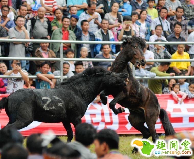 广西融水苗族自治县举行芦笙斗马节,近30匹雄马一决高下。斗马场中,在一匹雌马的诱惑下,两匹雄马相互撕咬、冲撞、缠斗,激烈的场面吸引现场近万名前来观看的游客。原为融水苗族同胞裁决婚姻而设的斗马已成为群众性的娱乐活动,已盛行百年。斗马也是国家首批非物质文化遗产“融水苗族系列坡会群”的主要活动。
